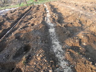 @良く耕した地面に深さ3センチメートル程度に、V字状に溝を掘ります。