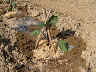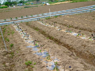 よく耕した地面に幅3〜4尺のマルチ(黒い農業用ビニール)を敷き、固定します。マルチの敷き方にはコツがありますが、おらホでは風のない早朝にしています。