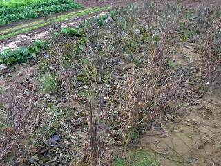 秘伝豆、こんなに大きくなりました。左側畝はキャベツです。