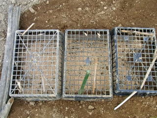 野鳩よけにホームセンターから頂いた苗カゴをを置き、葦棒で