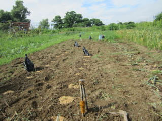 B2本ずつ植え付け、土を欠けます。溝も同時に埋めていきます。