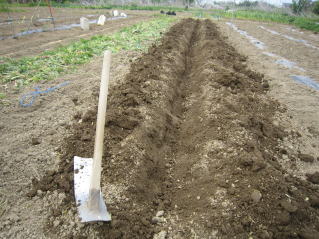よく耕した地面に深さ20センチくらいの溝を鍬で掘ります。畝幅は作業を考慮し1メートル位でしょうか。