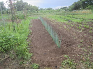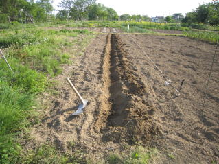 よく耕した地面に深さ20センチくらいの溝を鍬で掘ります。畝幅は作業を考慮し1メートル位でしょうか。