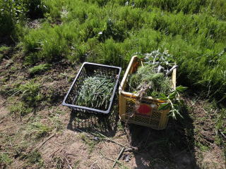 左収穫したニラ、右雑草です。スギナ(雑草)を取りながらのニラ