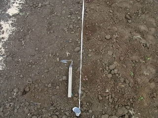 @良く耕した地面に移植べらで約30〜45センチ間隔で、直径約6センチメートル、深さ3〜4センチメートルの穴を掘ります。