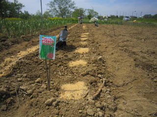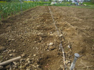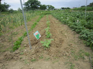 | 種まき 蒔き時 種はツル無しササギに決めている。ツルを這わせる支柱立てが面倒くさいからだ。 例年5月1日頃1回目を蒔き、芽が出て双葉になったら2回目と2回種蒔きしている。 これで、1ケ月くらい収穫を楽しむことができる。6月頃蒔いて9月収穫ということもあるが、やはり蒔き時というあるようで6月下旬に蒔くと育ちが悪かった時があったので種蒔きは5月中と決めている。(というか、外の作物に忙しくて手が回らないのがホントの話) ササギも他の作物同様水はけが悪いとダメで湿った特に地面に実が接触していると間違いなくカビがはびこってくる。また、最上川の洪水でおらホの農園が水没すると当然全滅となる。 蒔き方 @良く耕した地面に移植べらで約30〜45センチ間隔で、直径約6センチメートル、深さ3〜4センチメートルの穴を掘ります。 Aうね幅は60センチ位。何故か60〜70センチ。 Bここに2粒づつ種を置いていきます。この時まだ土を上掛けしません。 C買い求めた種の残り具合を確かめ、残っていたら適当に蒔き、足りないようだっらB種を拾い集め適宜蒔いていきます。 発芽 1〜2週間程度で発芽しています。 ポイント @穴のそこはできるだけ平面にしています。凹凸のある穴に種が蒔かれ土をかけると、かけられた土の厚さが一定でなくなり発芽しないものが出たり、発芽が早いものと遅いものが出てアンバランスとなります。 A密着しないように2〜3センチはなして種を蒔くと、お互いに邪魔し合わずに成長する。 B連作していません。 手入れ 肥料 収穫まで2回程度顆粒状合成肥料をパラッと根の周りに蒔いています。その時、両脇から土をかけて盛り上げ状態にします。おらホではこの作業を「サクヅガケ」と称しています。 害虫対策 余り害虫はつかないようですが、ついたら市販薬剤噴霧です。 それよりも発芽したばかりの芽を野鳩がつつくので、これが頭に来る。ポット植えして萎え移植する人もいますが、私は不要となったCDを棒状のものに糸でつるして、あのピカピカで脅かしている。 ポイント サクヅガケの時、茎が倒れないようにコンモリと土をかけています。地面にふれるとカビがはびこりますので注意しています。 収穫 スーパーで売っているような適当な大きさになったものから適宜つみ取っていきます。 大量に収穫したときはゆでて天日干しにして保存しています。保存したささぎは秋、冬に水で戻して煮付け(ささぎの戻し煮付け)にします。 調理 おひたし、イルカ汁、ささぎの戻し煮付けetc. |