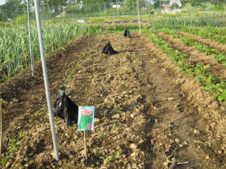 | 土、籾殻をかけて作業完了。黒い怪しい奴は野鳩から若芽を守る疑似ガラス。いわゆるカカシ。 2018.05.06 9:51 |