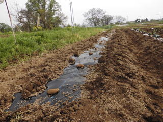 よく耕した地面に幅3〜4尺のマルチ(黒い農業用ビニール)を敷き、固定します。マルチの敷き方にはコツがありますが、おらホでは風のない早朝にしています。