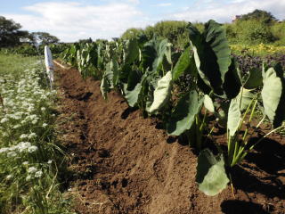 8月初旬頃芋の茎、葉が大きくなったら数本残し、残りの茎を間引き切り落とします。切り落とした茎、葉は茎の周りに置き土で埋めます。(肥料になる?昔からそうしています。)