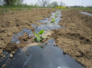 よく耕した地面に幅3〜4尺のマルチ(黒い農業用ビニール)を敷き、固定します。マルチの敷き方にはコツがありますが、おらホでは風のない早朝にしています。
