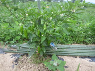 5月下旬頃、苗、葉っぱが濃い緑になって成長してきたら太めの市販イボ竹を支柱として立てます。