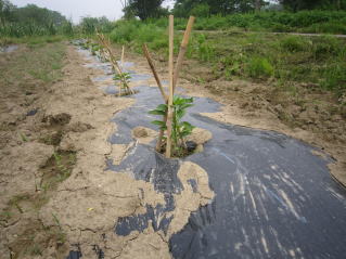 よく耕した地面に幅3〜4尺のマルチ(黒い農業用ビニール)を敷き、固定します。マルチの敷き方にはコツがありますが、おらホでは風のない早朝にしています。