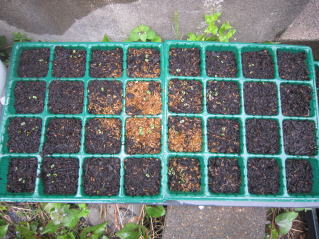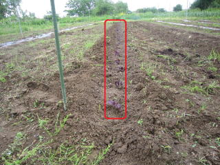 今回は種の蒔き方をスジ蒔きし、これを手のひらで軽く叩き種を固定してみた。 |