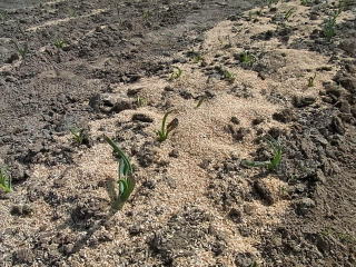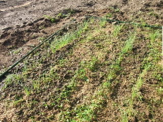 モヤモヤとタマネギの発芽を確認できます。今後、顆粒状肥料を