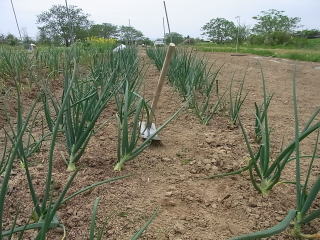 タマネギの周りの土を掘り返し、通気を良くなるようにしました。