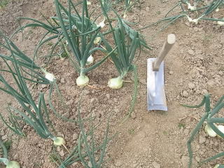 鍬の上のタマネギ苗。焼き鳥串程度の太さです。