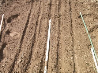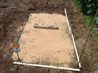種まき完了です。角材(横置き)で軽く叩き、種固定しました。
