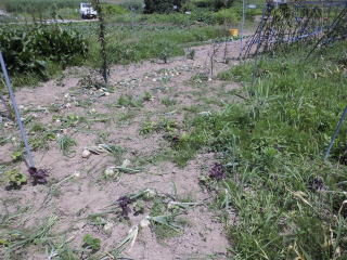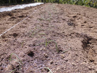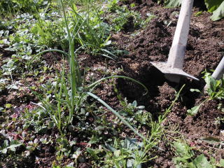 鍬左に見えるのがタマネギの苗。慎重に掘り超していきます。
