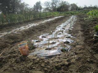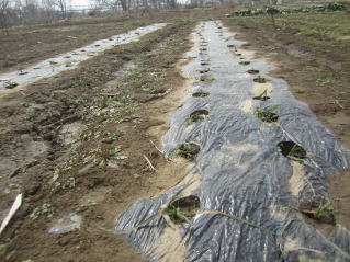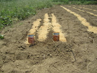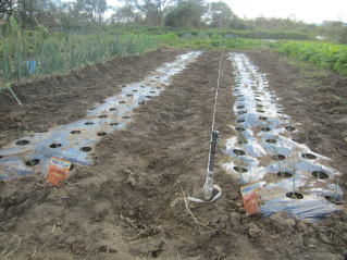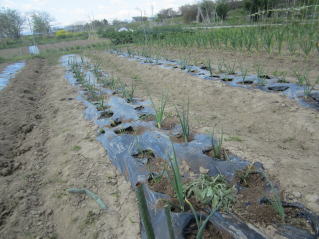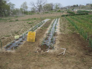 | タマネギはホームセンターで苗として売っているようですがコスト高。おらホでは秋に種を蒔いて苗を作り、定植します。収穫は翌年6月頃です。 種まき 蒔き時 例年9月1日前後にしている。人によってはポットに種を蒔き適当な大きさ(つまようじくらいの太さ、大きさ)になってから移植するが、おらホでは家庭菜園内で苗を作ってきた。 割り箸くらいの太さになってから定植している。 蒔き方 @良く耕した地面に高さ15センチ、幅45センチほどの床を作ります。 Aこの床に深さ3センチほどの溝を3本切ります。 Bここに1粒づつ種を筋蒔き風に置いていきます。この時まだ土を上掛けしません。 C買い求めた種の残り具合を確かめ、残っていたら適当に蒔き、足りないようだっらB種を拾い集め適宜蒔いていきます。 D土をかけてからその上に籾殻を籾殻を蒔きます。 ポイント 出来るだけ均等に薄く蒔き、間引きしないように心がけています。 手入れ 肥料 芽が出たら顆粒状肥料、尿素を蒔いています。ネギ類は肥料を与えた分だけ大きくなるようです。 雑草取り 雑草取りはマメにしなければなりません。 定植 準備作業 @良く耕した地面に尿素、油かすなど均等に降り、更に良く耕し数日間放置しておきます。 Aマルチ(黒いビニール)を敷き、固定します。これをまた、数日間程度放置しておきます。 定植 @穴開け器しい1畝3列、15〜20センチ間隔となるようにとなるように穴を開けていきます。 A1本ずつ苗を植えていきます。 定植後の手入れ 肥料 ネギ類は肥料を好むとありましたので、顆粒状肥料、尿素を2回ほど投入しています。おらホでいうサクヅカゲです。 収穫 例年6月中下旬頃でしょうか。適当な大きさのものから適宜収穫していきます。 |