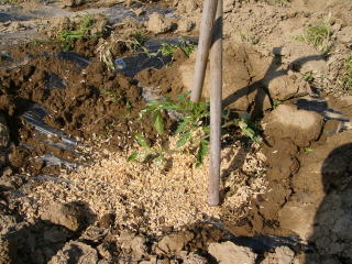 C風で倒れないように支柱(添え木)を当てます。(おらホでは周りにあるヨシを適当な長さに切って利用していますが、細めの市販のイボ竹を使ってもよいでしょう。)