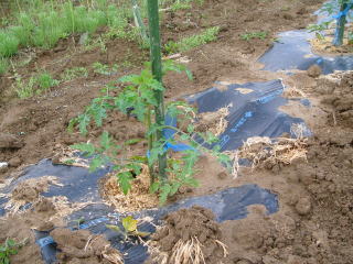 よく耕した地面に幅3〜4尺のマルチ(黒い農業用ビニール)を敷き、固定します。マルチの敷き方にはコツがありますが、おらホでは風のない早朝にしています。